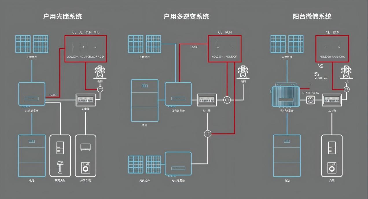 Hệ thống gia đình đa biến tần: Trong hệ thống PV/lưu trữ cơ bản, hệ thống PV/lưu trữ bổ sung được trang bị thêm để tạo ra cấu hình nhiều biến tần. Đồng hồ đo ADL tương tác với biến tần lai chính bằng cách giám sát dòng điện điểm kết nối lưới và thế hệ quang điện ban đầu để đạt được chức năng giám sát chống dòng chảy ngược.